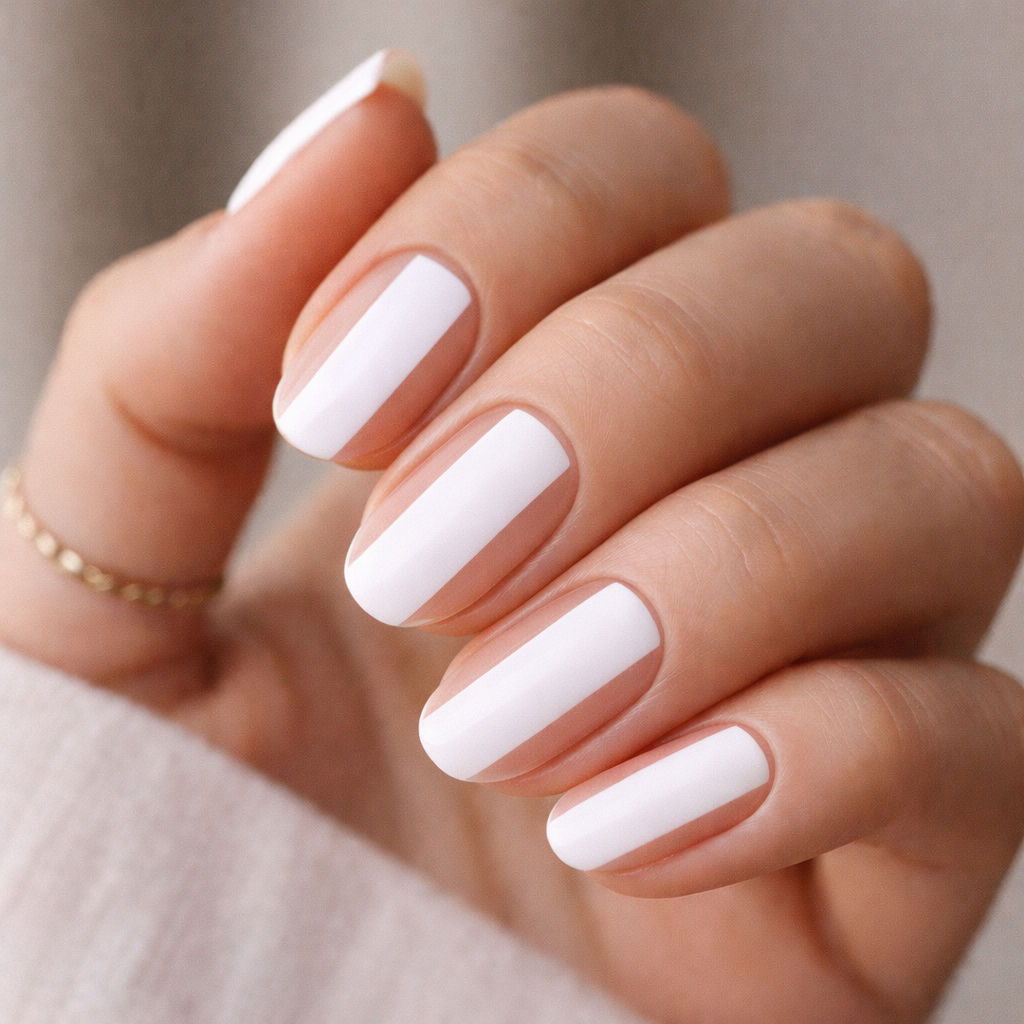 Cette variante consiste à laisser volontairement certaines zones sans vernis, notamment sur les bords de l’ongle. L’espace négatif accentue le contraste visuel et crée un effet graphique et moderne.